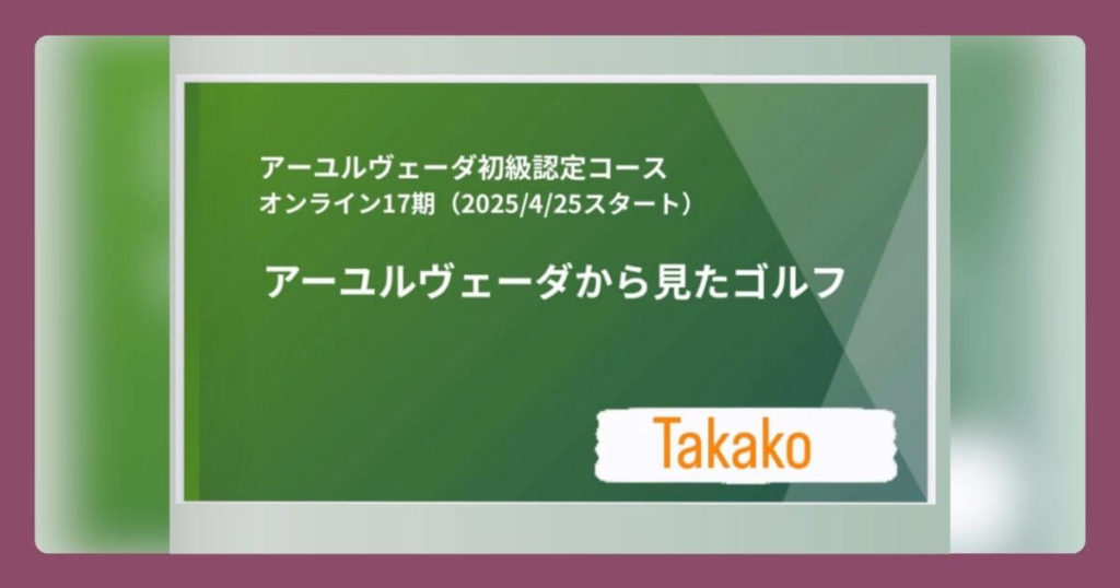 アーユルヴェーダ初級認定コース(2025)を再受講していました タイトル『アーユルヴェーダから見たゴルフ』えっ、ゴルフとアーユルヴェーダ!?意外すぎる組み合わせの秘密 こんにちは、Gran Yogaです。 今日は、書き上